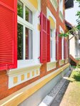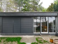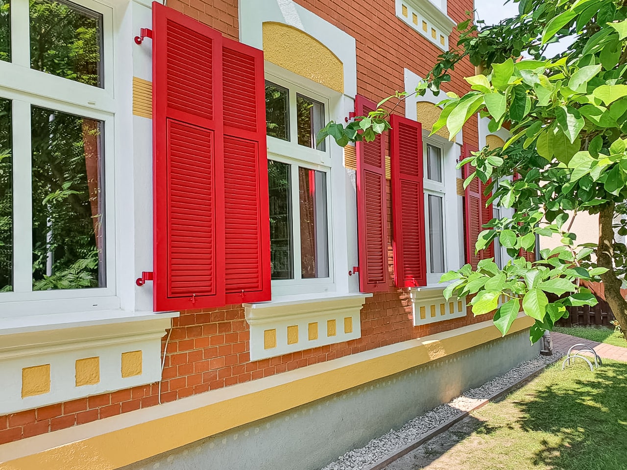 Fertiger Anbau von Fensterläden, Klappläden bei einem Einfamilienhaus.